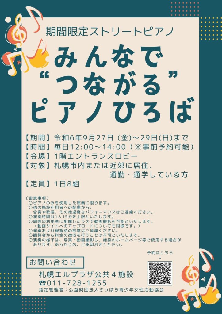 下記期間中、札幌エルプラザ公共4施設に寄附いただいた電子ピアノを施設利用者の皆さまに開放いたします。
