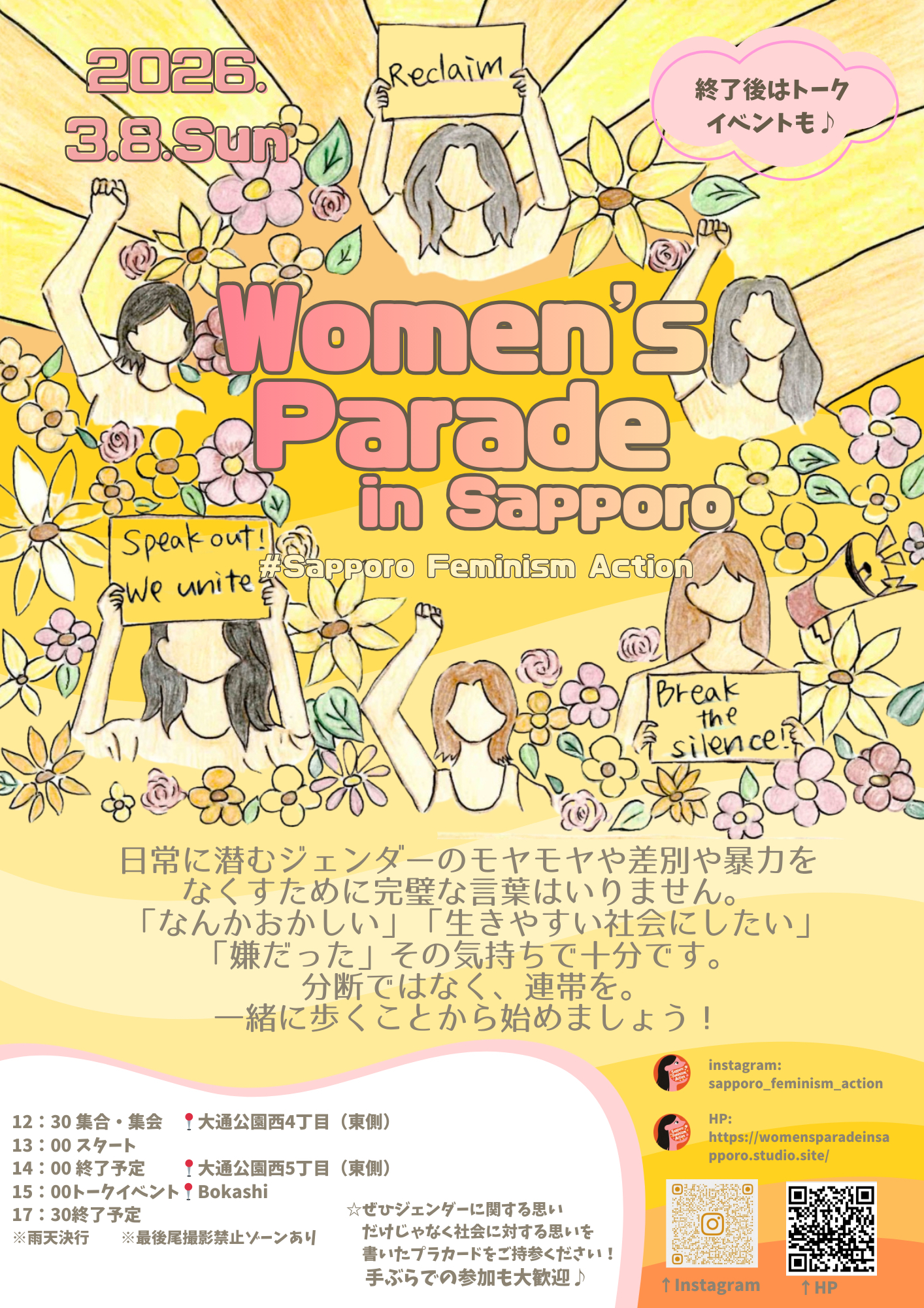主催のSapporo Feminism Actionは、札幌でジェンダー平等のために声をあげたい、仲間と繋がりたい、もっと社会のことやジェンダーのこと知りたい!というメンバーによって、2026年2月に発足された団体です。