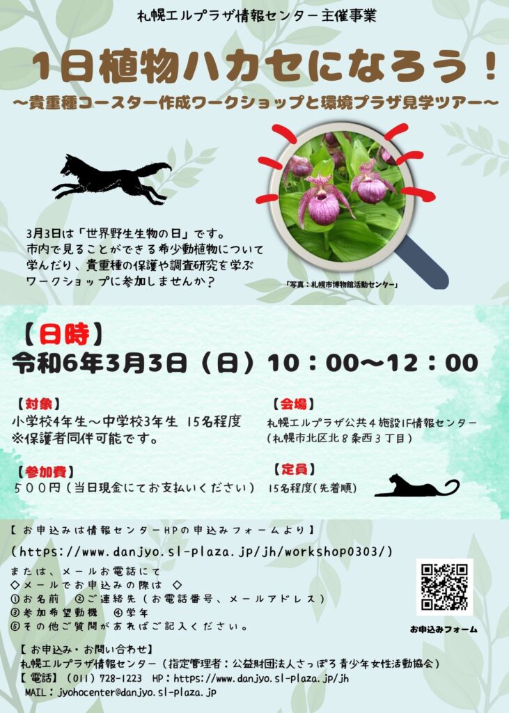 3月3日の「世界野生生物の日」に合わせて、札幌市内で貴重とされる自然植物について研究を行っている専門家から、 植物の生息地や生態について学び、自然植物保護を考えます。また、野生動物や貴重種に関するコースター作成や環境プラザにおいてエゾサンショウウオを観察することを通して、生物多様性について理解を深めます。ぜひこの機会にふるってご参加ください!