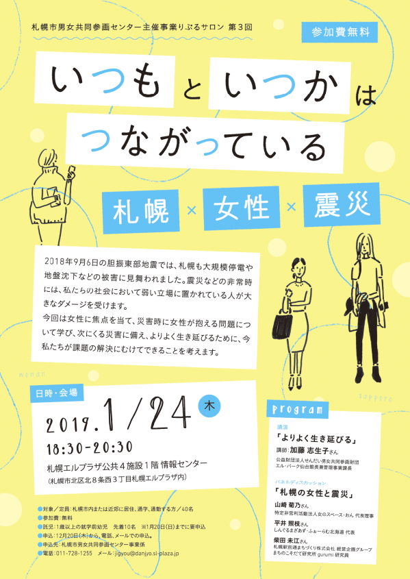 今回は、女性に焦点をあて、せんだい男女共同参画財団の加藤志生子さんから、災害時に女性が抱える問題について学び、札幌市の女性支援団体やまちづくりの会社とともに次にくる災害をよりよく生き延びるために、今できることについて考えるパネルディスカッションを行います。